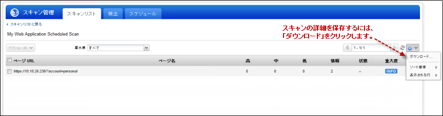 URL、重大度、スキャンのステータスなどのスキャン済みページの詳細は、選択した形式に応じて保存されます。表示