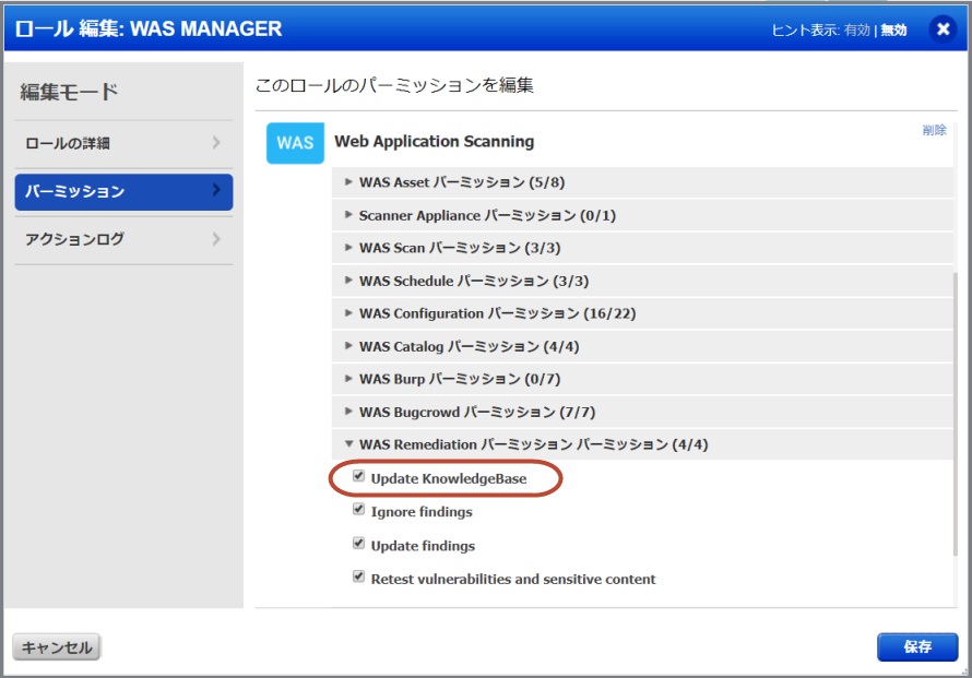 必要なパーミッション: 脆弱性に対して導入された新規アクションを実行できるようにするには、「WAS Remediation パーミッション」に「Update Knowledgebase」という名前のパーミッションを割り当てる必要があります。表示