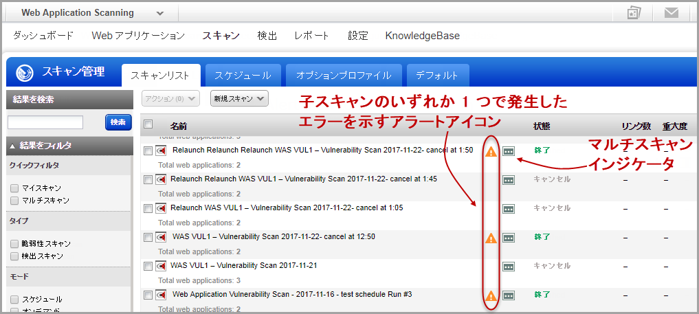 WAS アプリケーションは、非常にスケーラブルな Web アプリケーションスキャンソリューションです。複数の Web アプリケーションをスキャンする機能(マルチスキャン)が追加され、大量の Web アプリケーションスキャンプログラムに対応するための機能が強化されています。この機能により、膨大な量の Web アプリケーションをスキャンし、実行中のスキャンやスキャンが完了しているアプリケーションなど、さまざまなニーズに対応した情報を確認することが可能です。