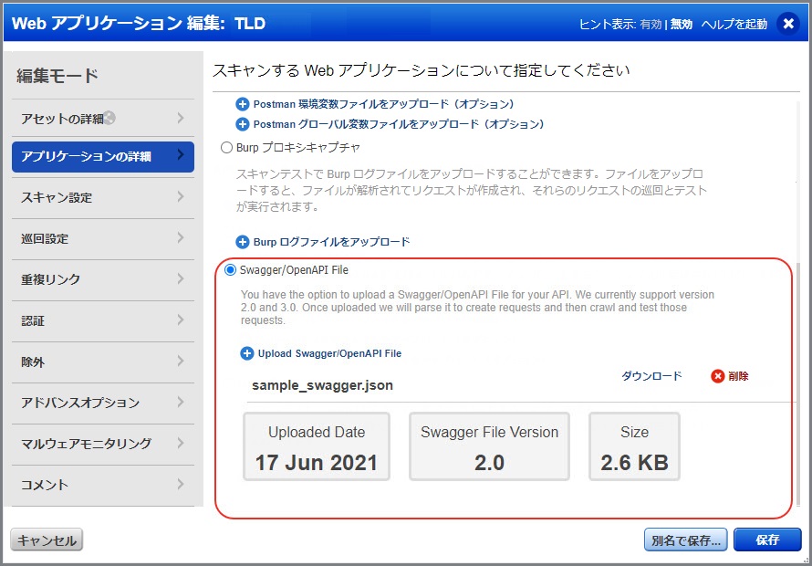 API エンドポイントおよび Swagger ファイルをスキャンする場合、このオプションを選択します。Swagger ツールは、REST API のテストに使用され、REST API をエクスポートおよび共有する機能があります。Swagger/OpenAPI ファイルを JSON または YAML 形式でアップロードすると、脆弱性がスキャンされます。表示